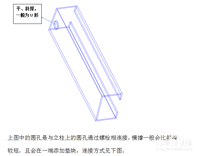 圖中的圓孔是與立柱上的圓孔通過螺栓相連接,橫撐一般會比斜撐較短,且會在一端添加墊塊,連接方式見下圖。
